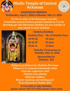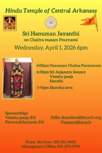 | Sponsor | Visesha Pooja – $51, Naivedyam – $51, Flowers and Garlands – $51, Hanuman Deeksha – $25 |