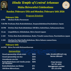 | Sponsor | MahaSeva – $1008, Grand Sponsorship whole event (Shivarathri and Shiva Parvati Kalyanam) – $516, Grand Sponsorship one day – $301, Annadanam both days – $251, Rudrabhishekams and Visesha poojas all 4 kalams- $201, Annadanam one day – $151, Kalyanam – $101, Rudrabhishekam one kalam – $75, Visesha Pooja- 108 Silver Bilvarchana – $51, Flowers and Garlands – $51 |